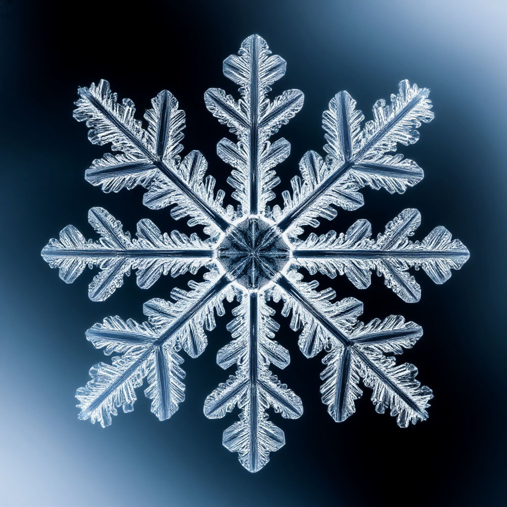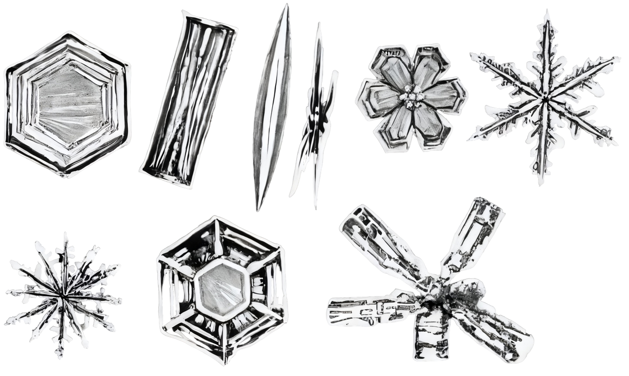 Кристаллическая структура воды определяет уникальную форму снежинок. Между лучами кристалла возможны только углы 60° и 120°, что делает каждую снежинку шестиконечной. Учёные выделяют несколько основных форм: